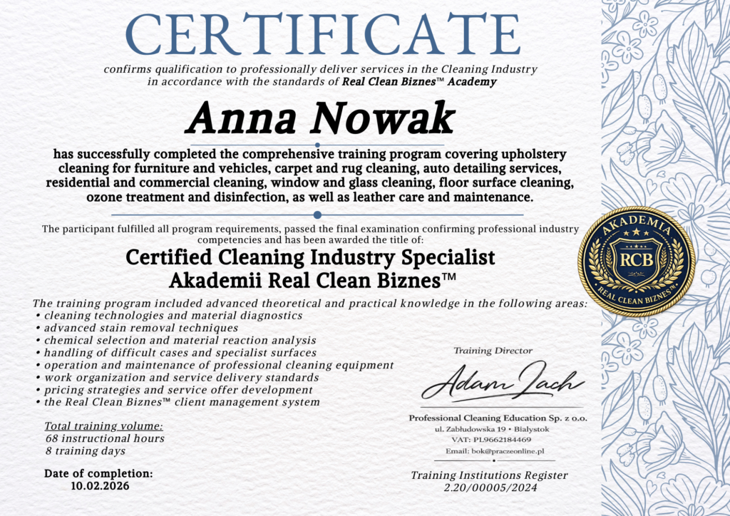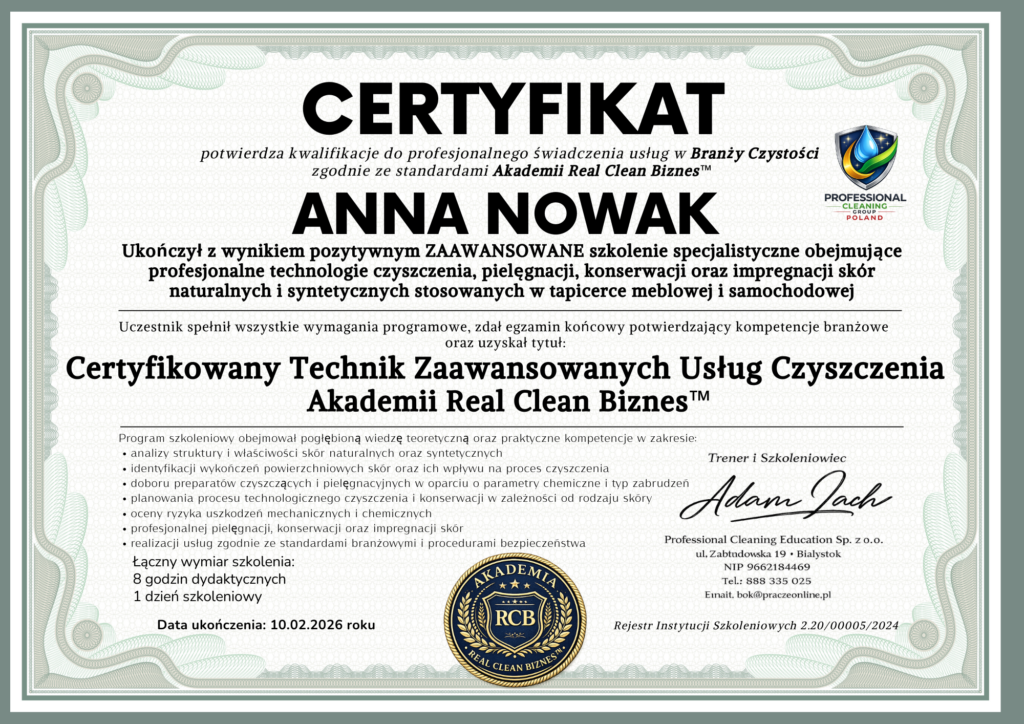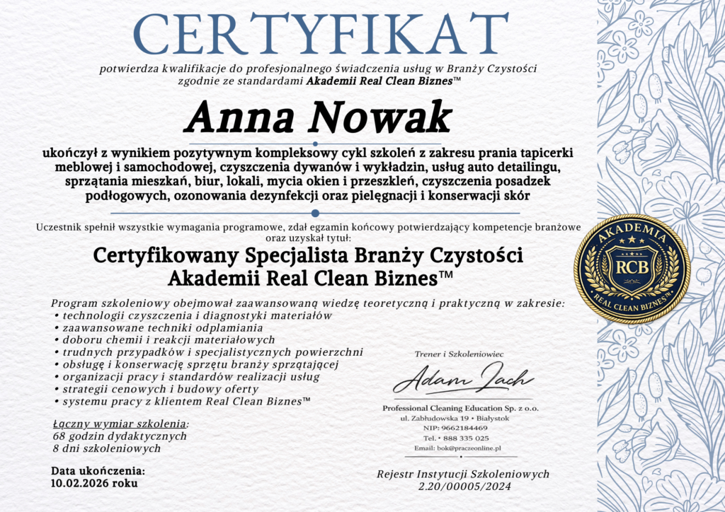 Szkolenie z prania tapicerki w Pakiecie VIP to najbardziej rozbudowany kurs online w Branży Czystości. Już od pierwszych lekcji poznajesz procesy prania tapicerki, dywanów i skóry w metodzie Real Clean Biznes™.