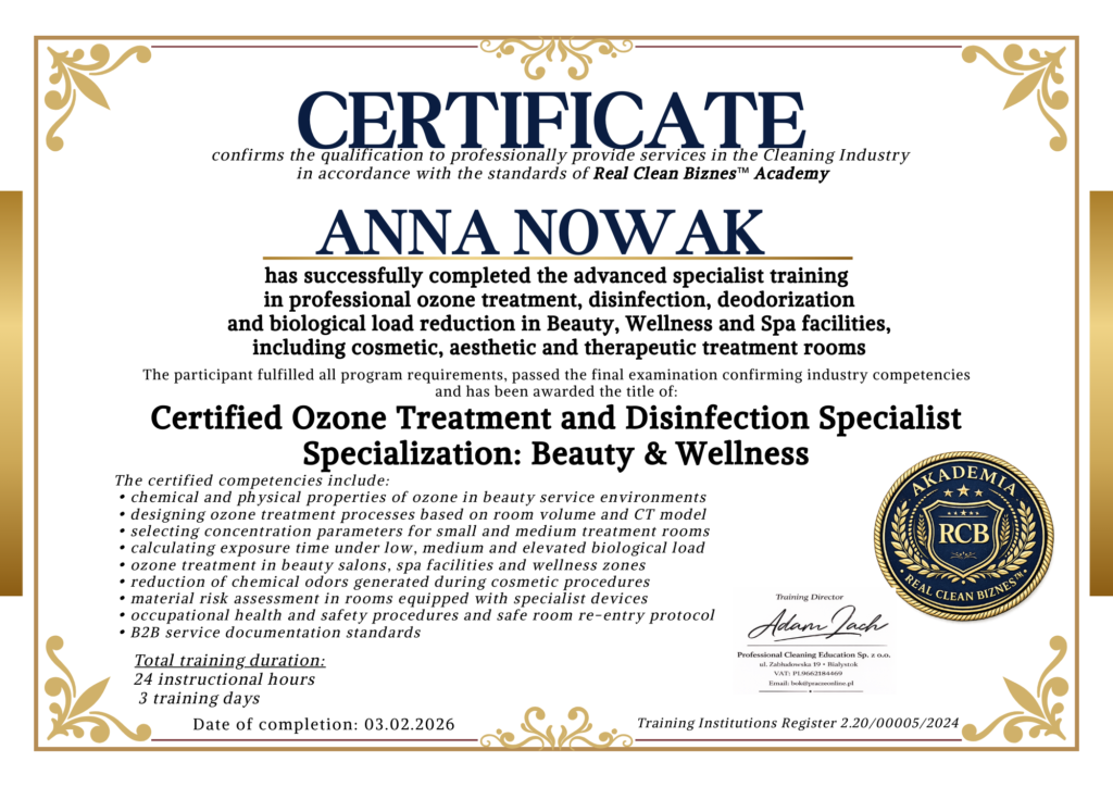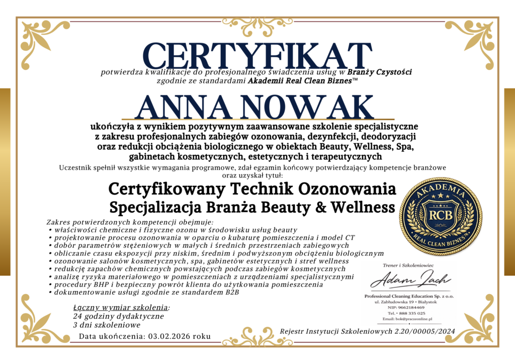 Szkolenie pozwala wprowadzić usługę ozonowania jako element podnoszący standard bezpieczeństwa biologicznego, eliminujący uporczywe zapachy chemiczne oraz wspierający system jakości w obiekcie.